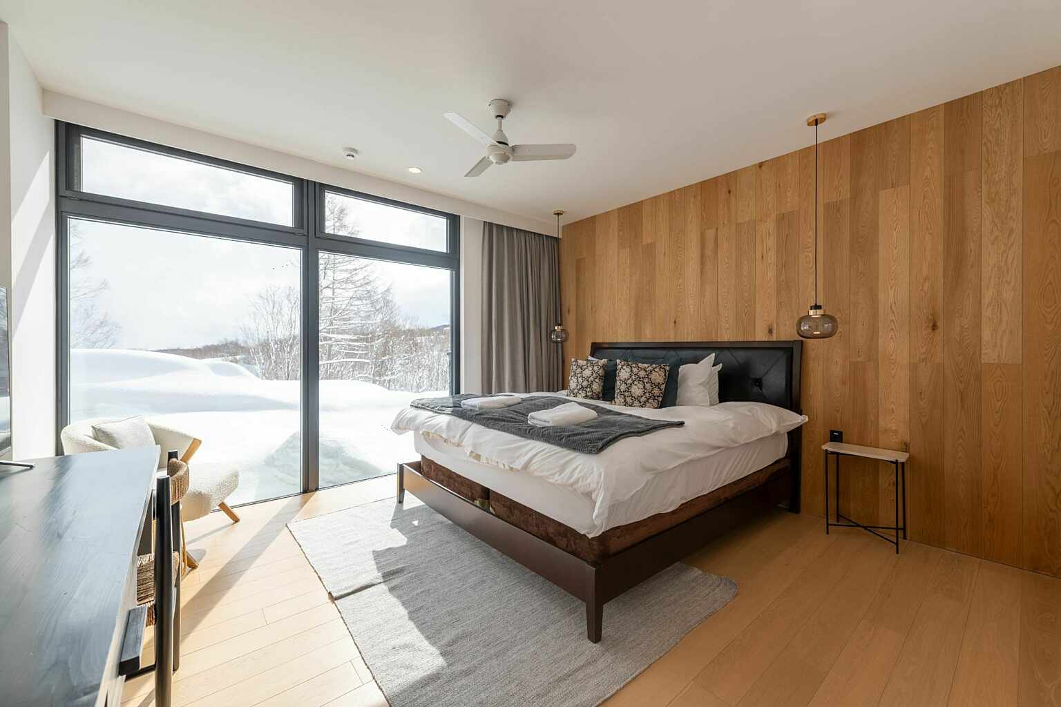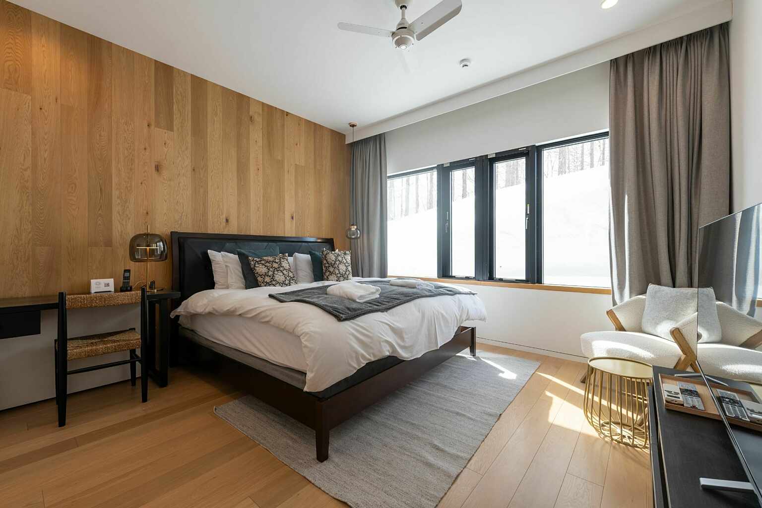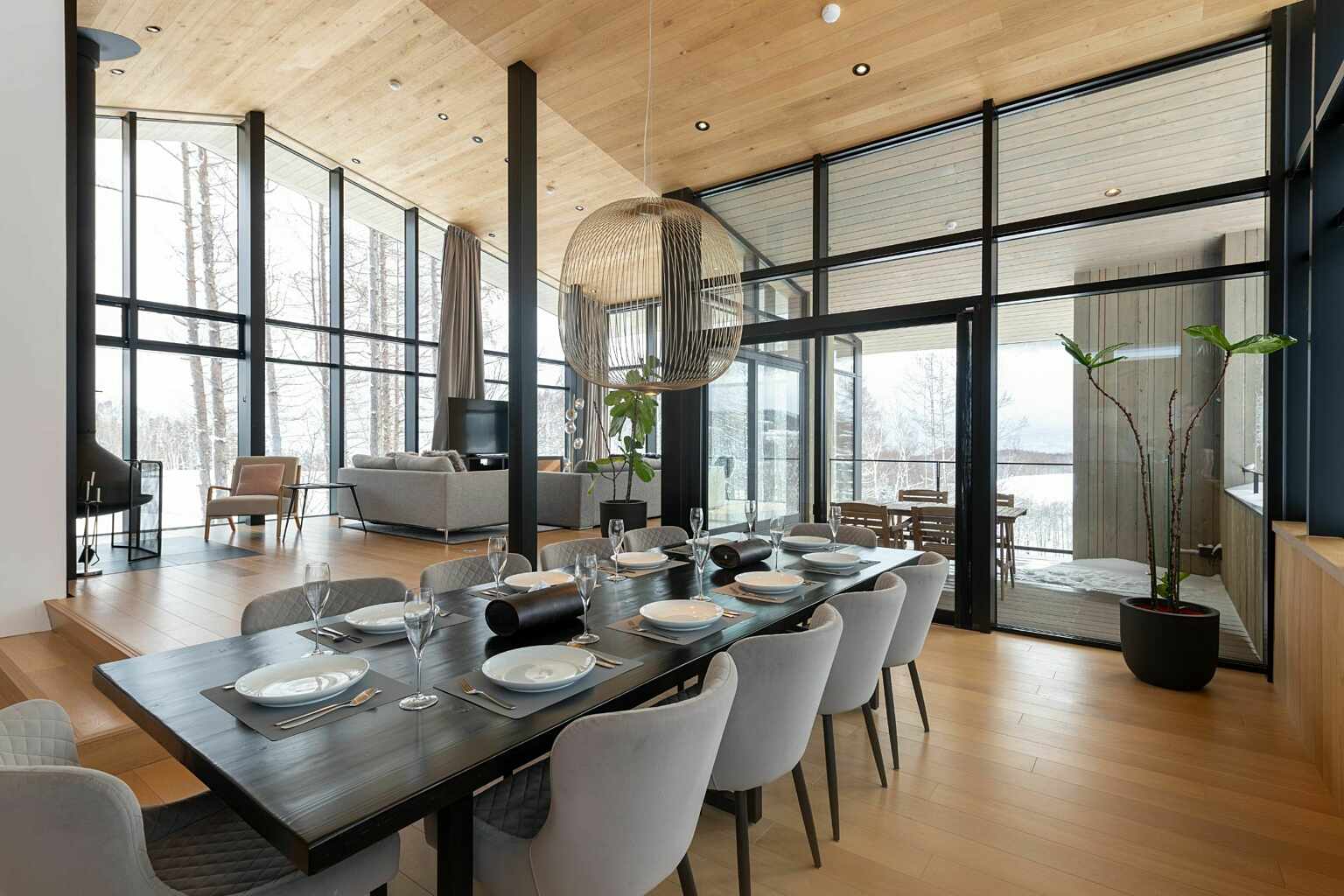 Inside, the open-plan living and dining area conveys quiet elegance: soaring ceilings, warm wood textures, and natural stone details set the tone. Floor-to-ceiling windows frame sweeping views of Mount Yotei and the Hanazono forest. After a day on the slopes, dip into your private onsen, cosy up in the media room, or pour a glass of wine from the cellar.