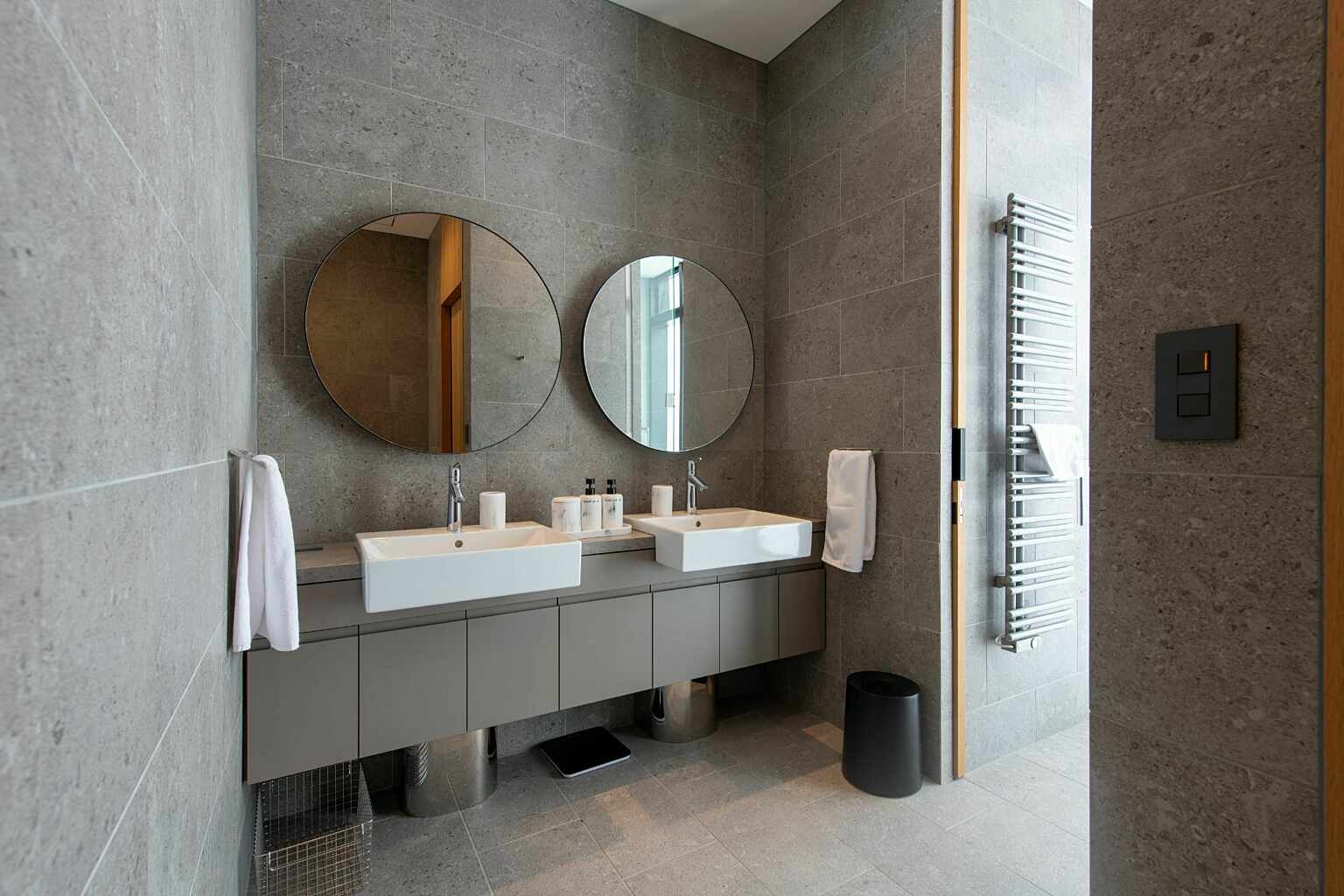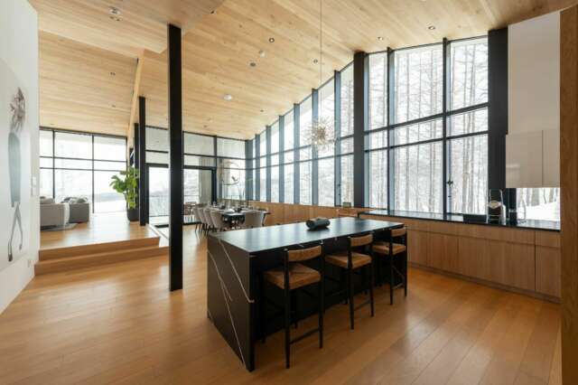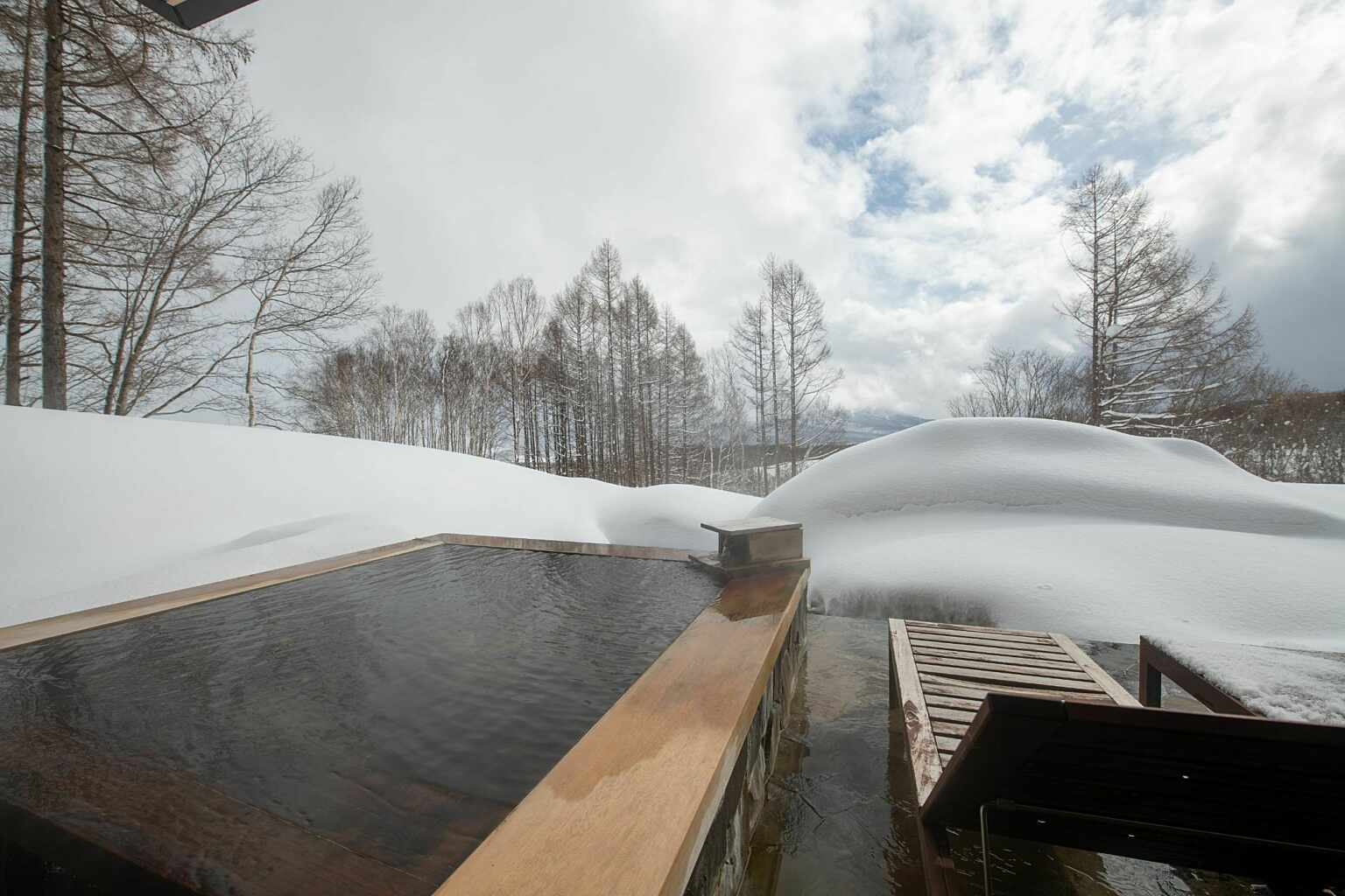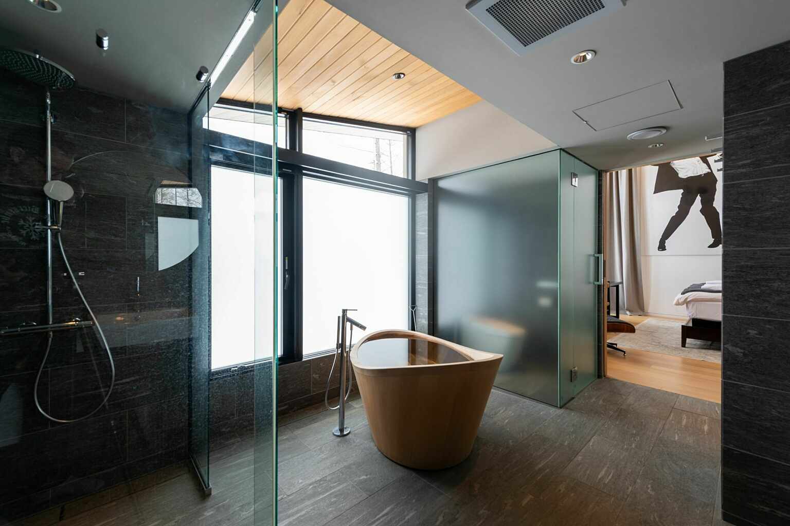 Inside, the open-plan living and dining area conveys quiet elegance: soaring ceilings, warm wood textures, and natural stone details set the tone. Floor-to-ceiling windows frame sweeping views of Mount Yotei and the Hanazono forest. After a day on the slopes, dip into your private onsen, cosy up in the media room, or pour a glass of wine from the cellar.