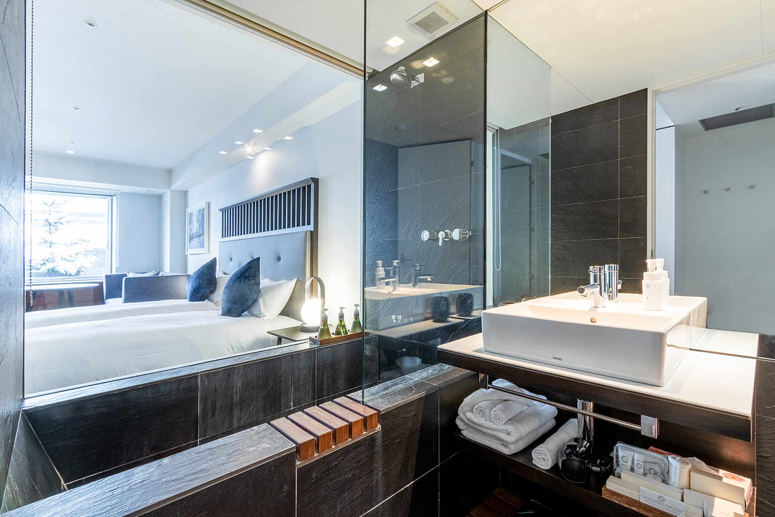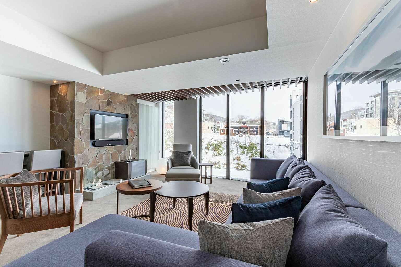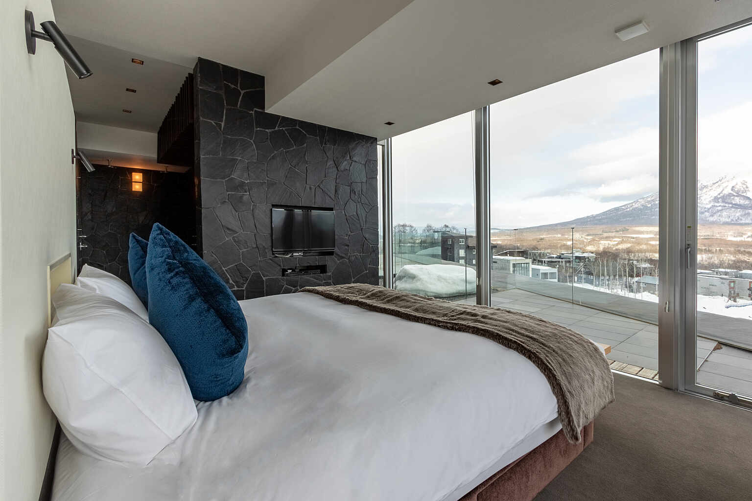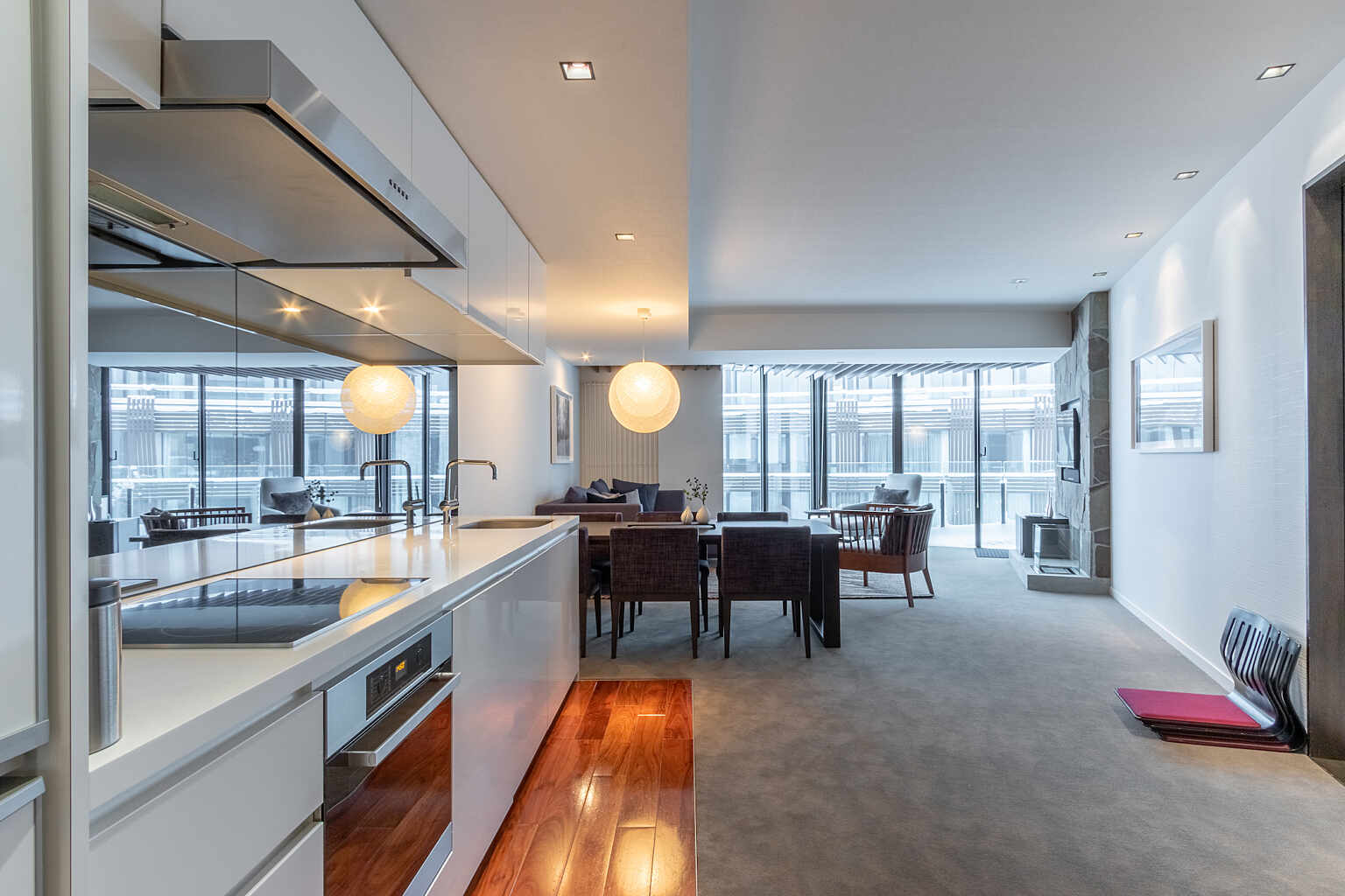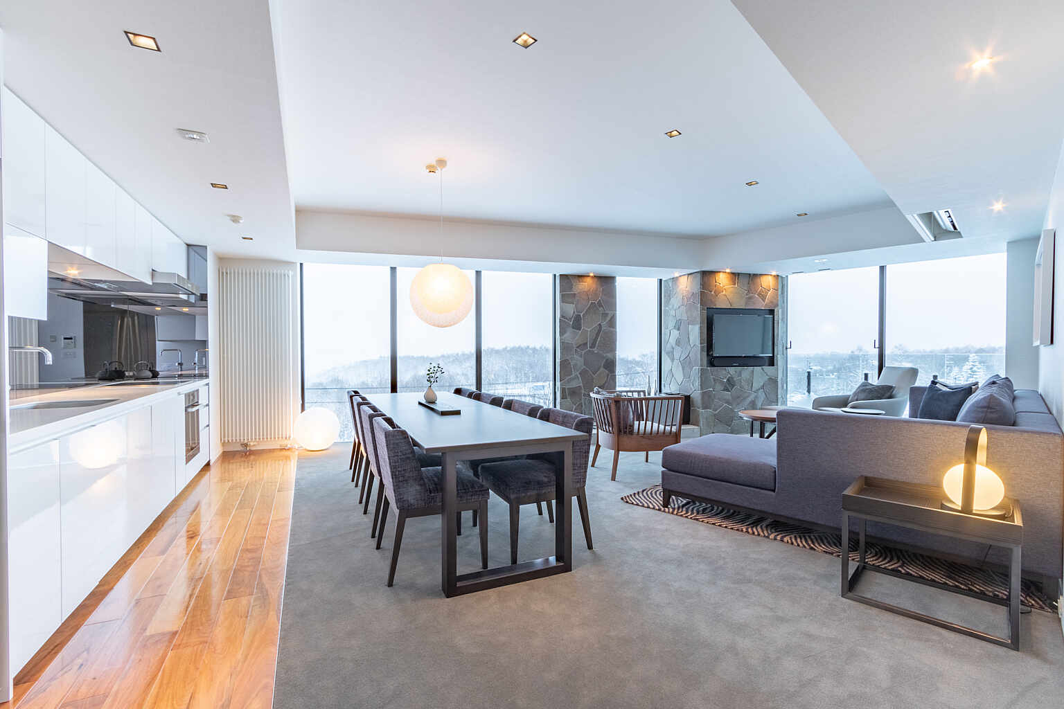 Each spacious 1- to 3-bedroom apartment is clad in a modern mix of stone and timber, and has a kitchen area, a washer and dryer, and other appliances. Selected accommodations offer a private onsen and balcony — perfect for après-ski moments with a view.